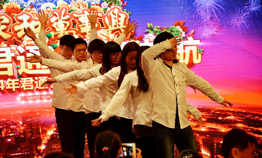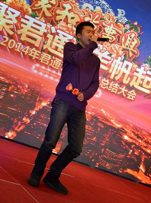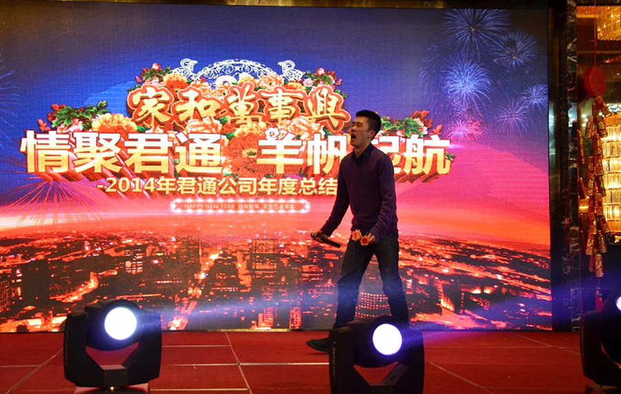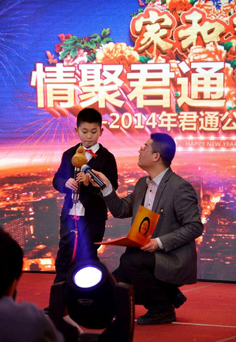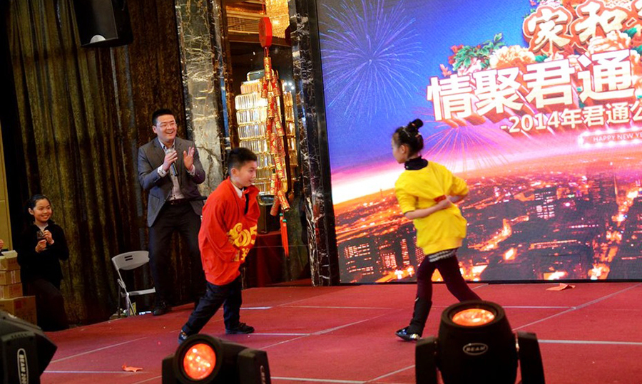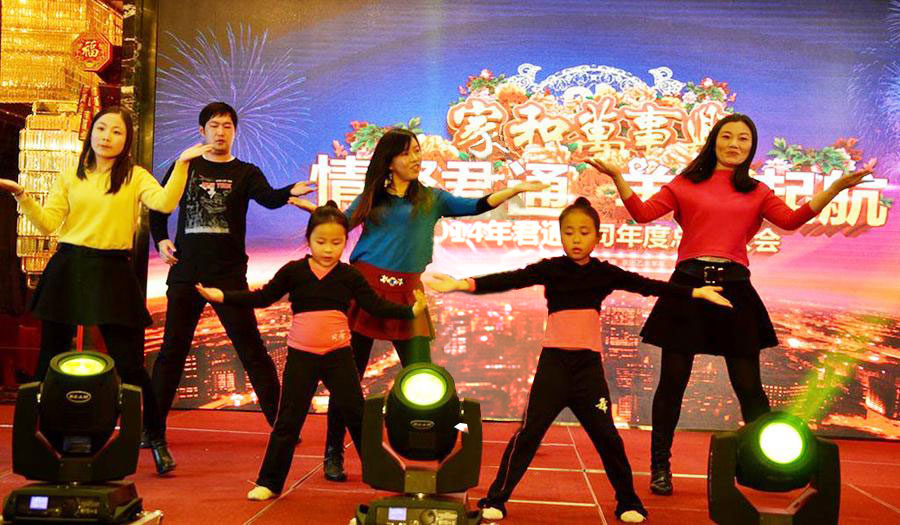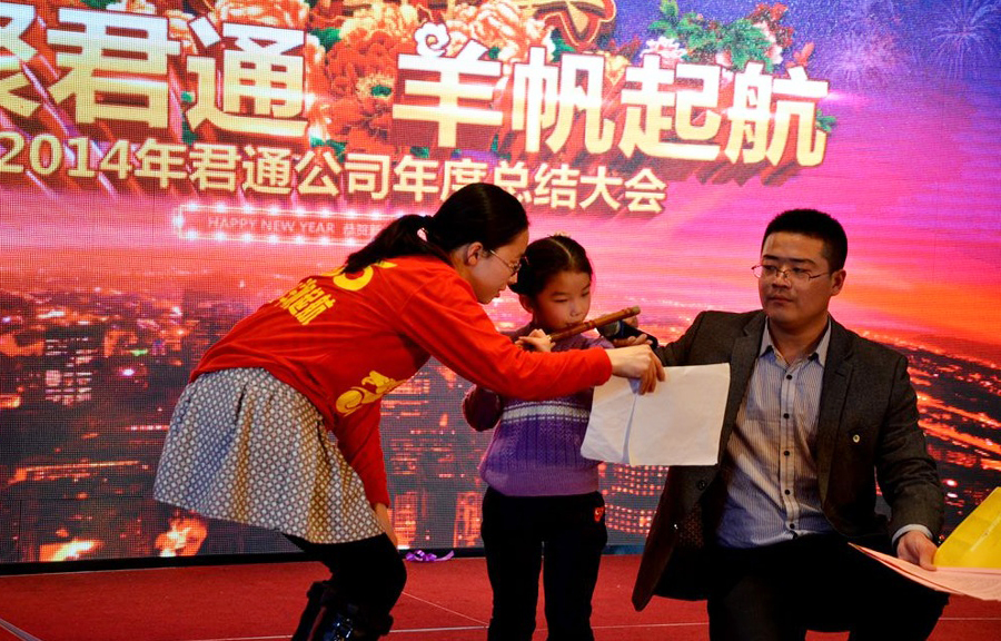 2015年2月11日,民间俗称的小年,好日子。 立春后的江南阳光灿烂,温暖如春。 太湖畔的同庆楼百合厅流光溢彩,喜气洋洋。身着节日盛装的青春少女鱼贯而入,留下银玲般的笑声,走过她们身边,仿佛被青春撞了一下腰。 君通春晚在欢快的乐曲声中,在员工的欢呼声中拉开了帷幕。 君通总经理尹可珍女士发表了热情洋溢的新年贺词。2000年10月尹可珍女士创立君通公司,几度风雨几度春秋,君通经过十四年发展成为本地IT行业中实力强的企业。熟识我的博友可能都知道,可珍晚常提到的君子兰,我好的女朋友。很开心参加这个欢乐的盛会,虽没有明星大腕,没有星光灿烂,却是每个君通人的倾情演绎,真情流露,好。 ![]() 君通的春晚现场仿佛是一个欢乐的大家庭,演出以部门家庭为单位,更有许多员工可爱的孩子也表演了许多节目。 市场部的美女妈妈带着双胞胎女儿跳起了欢快的《小苹果》