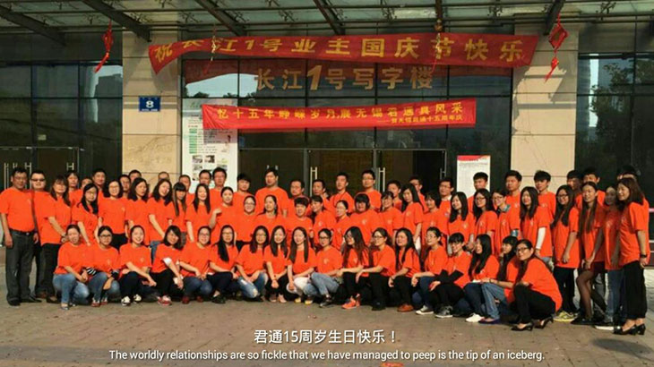下午3点半,君通人齐聚一堂,首先大家一起唱君通之歌,下面是颁奖了,每个在君通工作的员工,尹总都发了纪念品,在君通工作15年跟随公司一起的前辈们,都不禁感叹时间飞逝,情到深处都流下喜悦的泪水,而我在君通也快四年了,也见证了君通的成长,在君通收获了很多,我们一起祝福君通,伴随君通。后我们的大家长尹总发言,台下响起一阵阵的掌声,的确君通承载了大家的青春,大家的梦想,君通15岁我们一起走过,下一个15年,君通人坚信风景会更好!