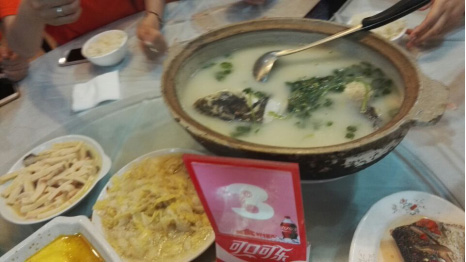 在品味过天目湖的白茶后,大家都已经是饥肠辘辘,来到饭店后,我们终于尝到了传说中的鱼头汤,汤的味道不同于普通的鱼汤,味道鲜美而且能感觉到自然的味道,在鱼头汤的面前,其他的菜都已经黯然失色,没过多久汤被大家分光了。