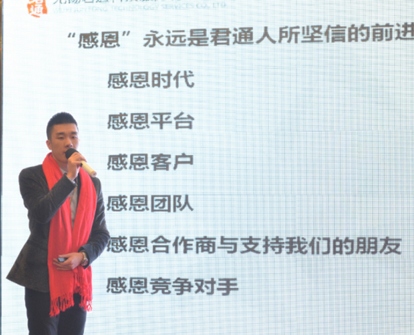 “我要感恩这个时代推动了IT行业的发展,使君通在互联网的浪潮中得以持续发展;感恩广大客户对君通的认可与信赖,一如既往的支持与厚爱;感恩君通伙伴们一路以来为公司发展付出的智慧和汗水;更感恩幕后的君通伙伴们的家人们对大家工作的支持!”我们的掌舵人尹总一直坚持奉行“以人为本、客户为本、诚信赢天下”的经营理念, 为广大客户朋友们提供高品质的产品和服务,使客户在售前、售中、售后的每一个环节都得到贴心服务,与客户共同发展腾飞,走向世界!