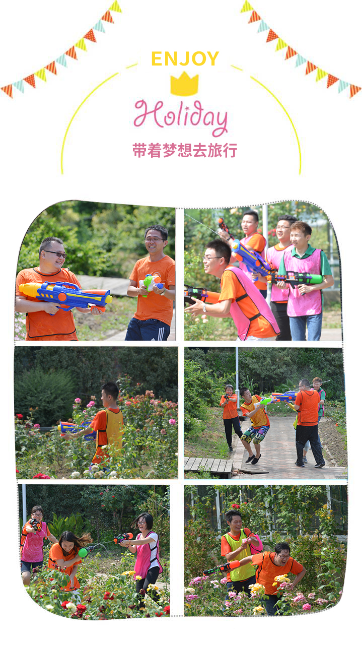 中午休息时间,我们扎堆儿的在聊生活,畅谈人生,下午2点钟我们准时开始活动,先是大脚板游戏,这个游戏要求每个成员相互配合共同完成,大家一起喊着口号一二一二,左右左右,已经不去过份关注成绩了,只要我们一起到达终点已经成功了。然后是水枪大战了,一人一枪,分队行动,战争顿打响了。不一会儿工夫大家都湿身了,但是还是玩得不亦悦乎,找到了童真,仿佛回到了童年时代。