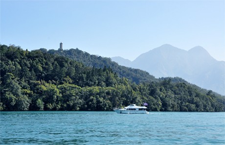 远处隐约可见的慈恩塔,它是蒋公于1971年为了纪念母亲所建,仿辽宋古塔式样八角宝塔。该塔建在海拔955米的青龙山顶上,塔高9层、高约45米,塔顶正好是海拔1000米。慈恩塔是日月潭景区的高点,站在塔顶,不仅可以看到日月潭拉鲁岛、玄奘寺与慈恩塔皆同在一条中轴线上,还可将日月潭美景尽收眼底。因为时间关系我们没有到访参观,有唏嘘遗憾,