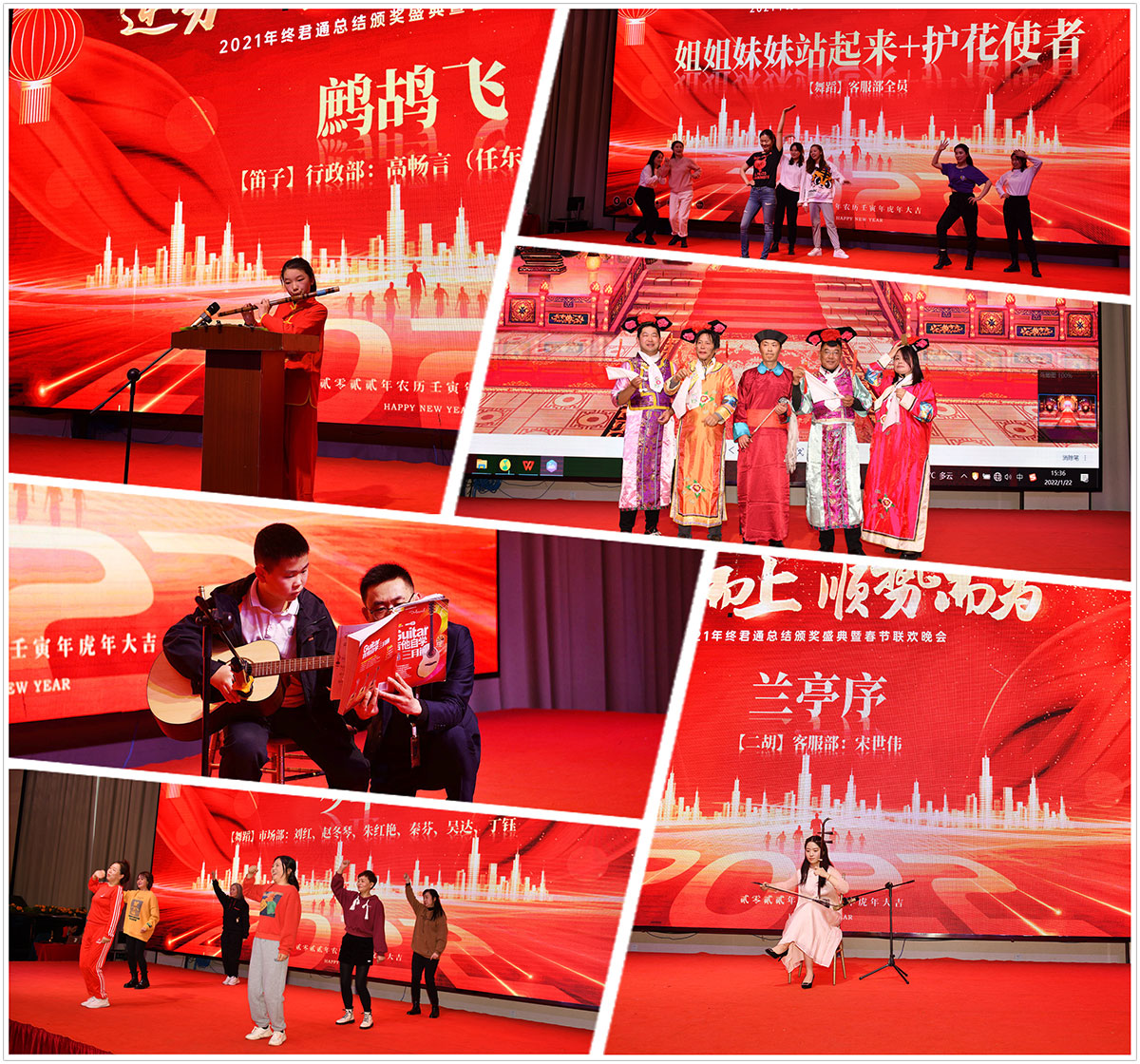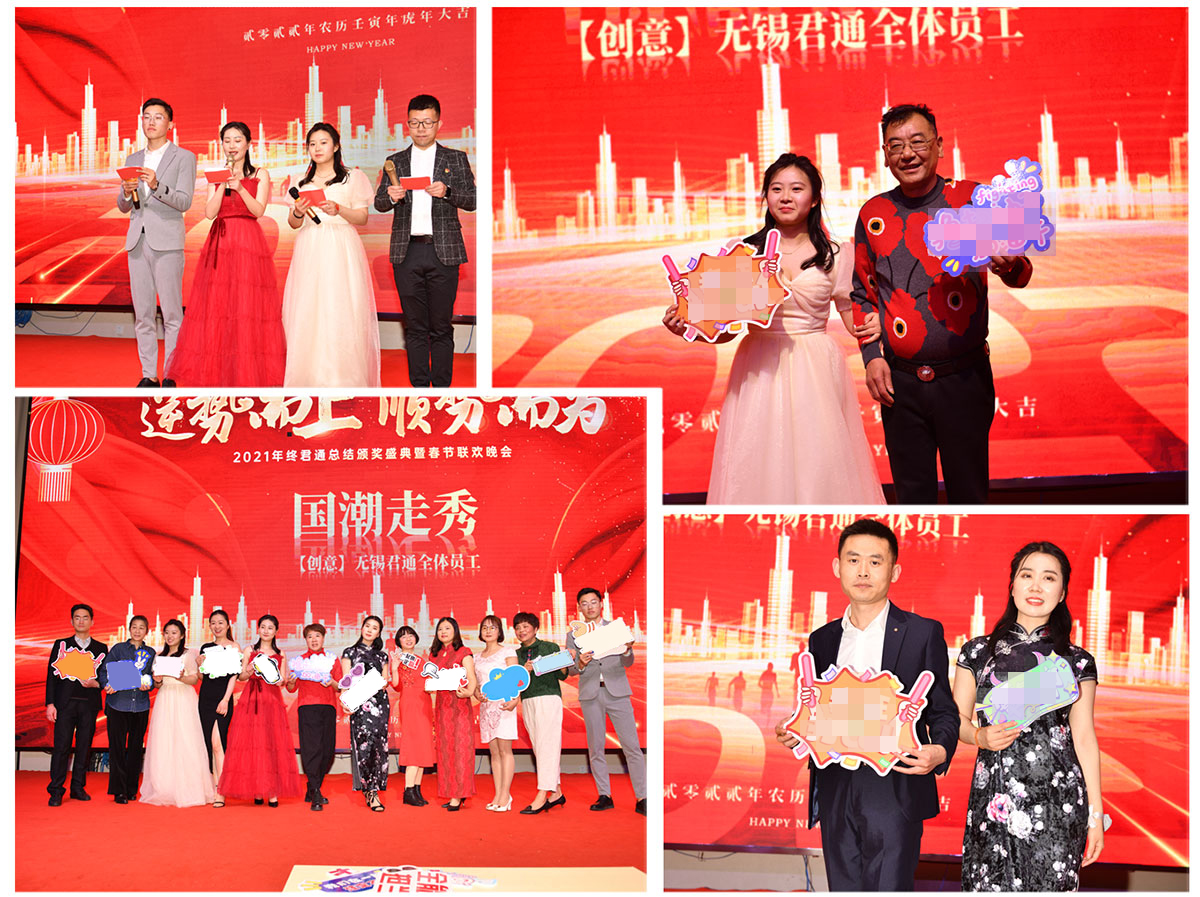 丰盛的晚宴,丰厚的礼品,是大家最期待的哦,今年康总和尹总为大家准备了很丰厚的礼品,希望大家都能抽到奖品,今年的一等奖花落在了技术部的蒋瑜娟,最后康总和尹总为了让更多的人拿奖还设置了好多现金奖,晚宴期间大家纷纷上台亮嗓子,唱出自己的拿手歌,幸福和快乐的时光总是短暂的,大家吃好玩好也嗨好了,希望2022年大家继续加油,继续服务好我们的客户,逆势而上,顺势而为,2022年我们已经做好准备,整装待发,踔厉奋发,笃行不怠,不忘初心,未来可期,无锡君通祝大家新年快乐,虎年大吉!!