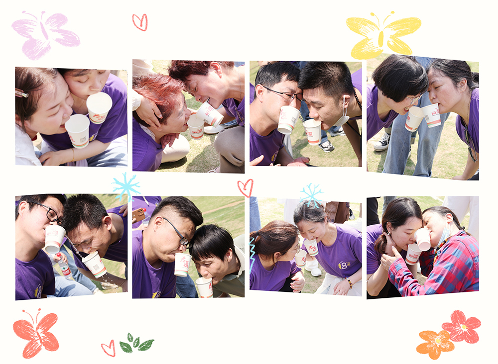 “蒙眼互打、纸杯传水、桃花朵朵开、词语接龙”等同舟共济趣味游戏,体验和小伙伴们在一起时合作的力量与温暖,团结就是力量!
