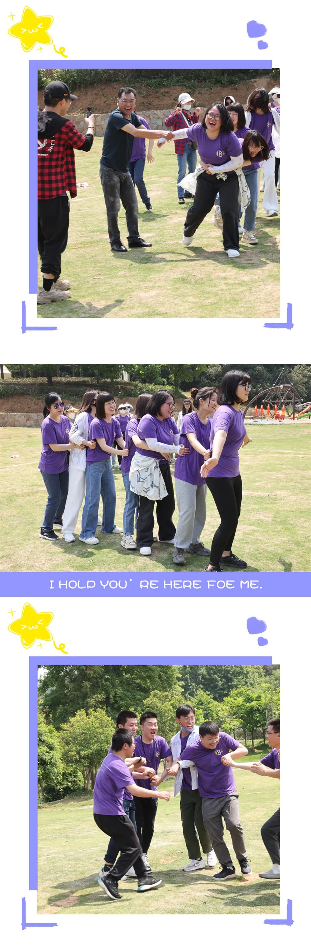 为了增强团队的凝聚力,我们组织了“蒙眼盲打”“被子传水”“语句接龙”“桃花朵朵开”的游戏,这时候我们不谈工作、不谈业务、我们谈...笑风声。