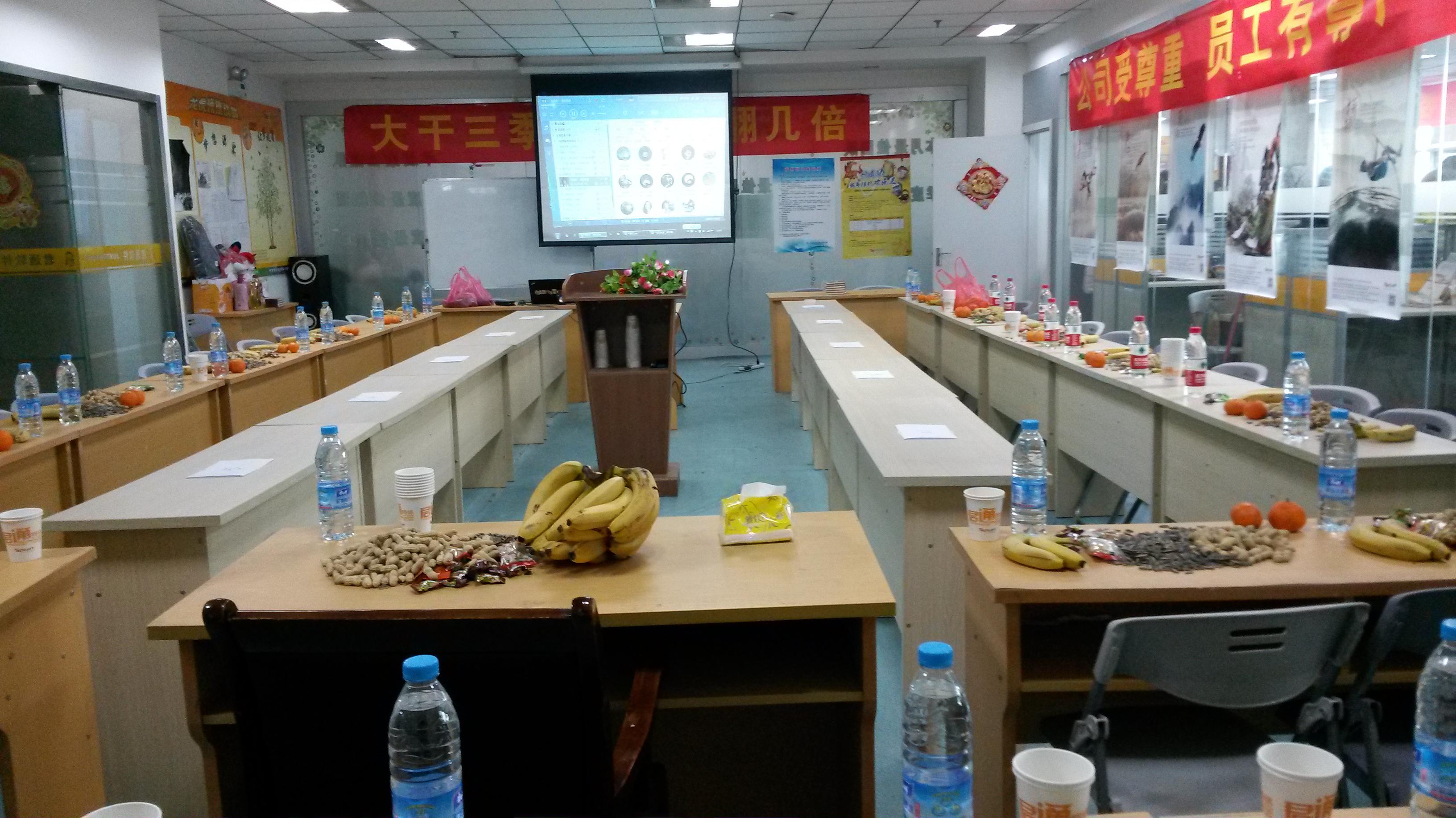 终于等到了星期天,早上起床,阳光明媚。老天爷仿佛也在为我们的“一站到底”总决赛呐喊,助威。我刚踏进到公司隐隐约约感受到过年的气息,小伙伴们脸上都洋溢着灿烂的笑容,从前台一路走到我的办公位置的途中,我用余光瞥到了会议室中翻天覆地的变化,使我大吃一惊。本来六排的办公桌,现在已经被排成了一个长方形,讲桌屹然伫立在舞台中央,桌子上摆满了瓜子、花生、香蕉、橘子等各种零食。这时候,邱总说让我们做好准备,迎接下午的挑战!