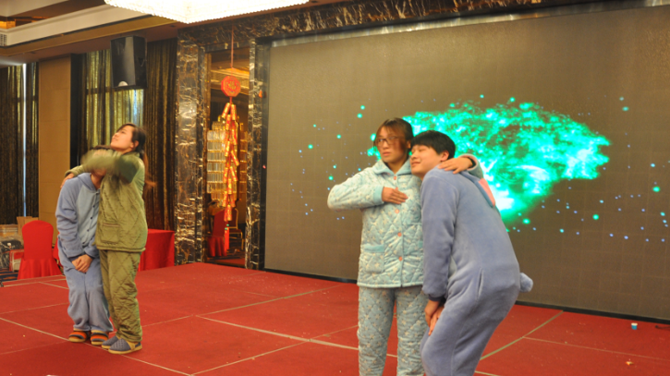 在整个晚会节目中我不得不说说我们君通的超哥和浦斌,超哥何许人也?姓蒋名超,无锡人,人高微瘦。2013年因《甄嬛传》而一炮走红,可谓是君通人家喻户晓,浦斌又是何许人也?大家早已耳熟能详了,君通销售精英,去年和超哥这个铁搭档联袂出演《甄嬛传》精彩绝伦。今年这铁两角又会为大家带来什么样的精彩节目呢?