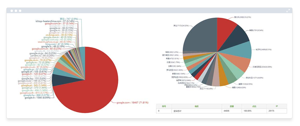3、从一个月的来访总数据来看,大部分采购商通过google主站搜索后访问网站,但也有是通过google分站、yahoo、bing、yandex等主流搜索引擎搜索后访问网站的;据后台数据显示,一个月内共讲有171个国 家29175家采购商访问过该网站