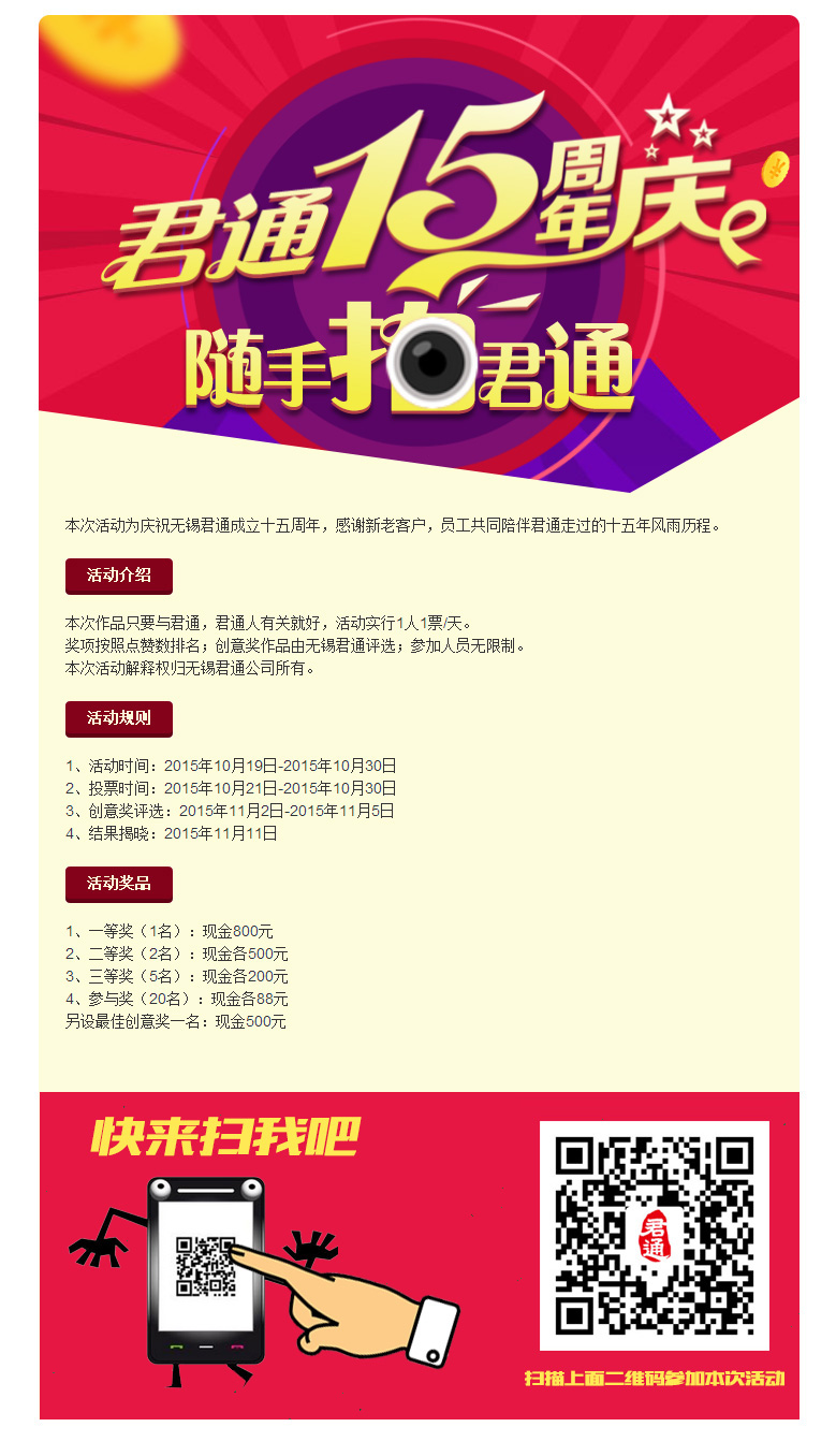 本次活动为庆祝无锡君通成立十五周年,感谢新老客户,员工共同陪伴君通走过的十五年风雨历程。