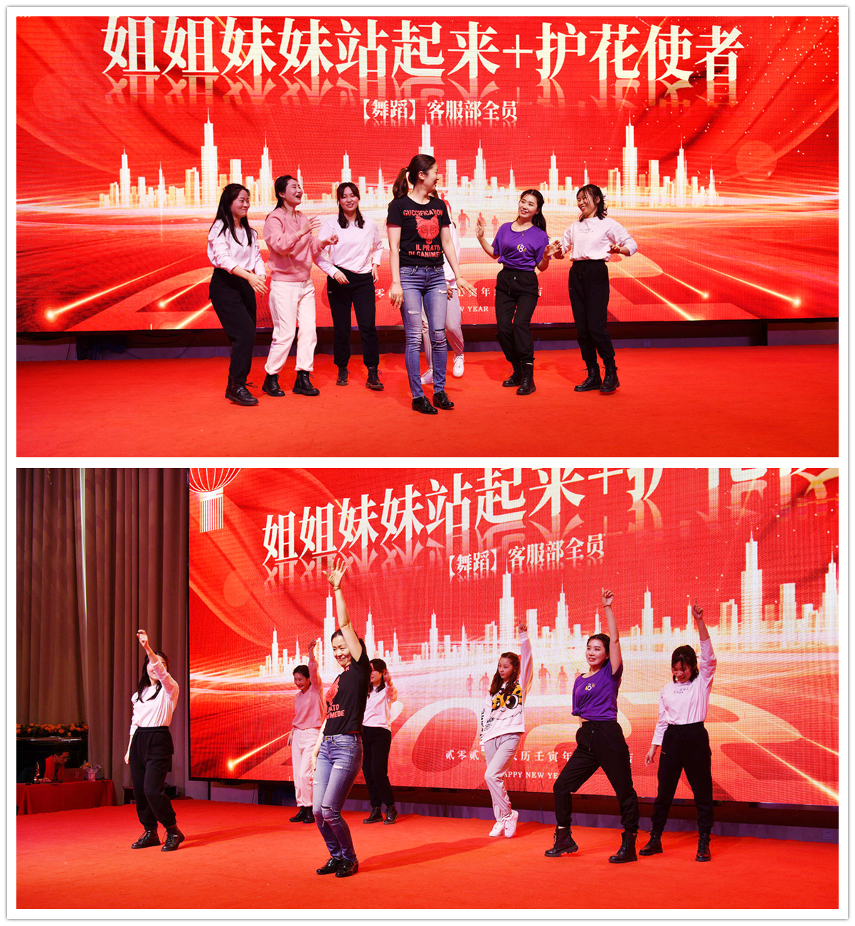 每次我们客服部的节目都是全员登场全员参与,算是参与度最高的一个部门了,接下来我们客服部的全员美女们又将为我们带来一个稍微有点点小的节目,舞蹈串烧《小人舞》,你看C位的妮妮笑得人仰马翻的,台下掌声尖叫不断: