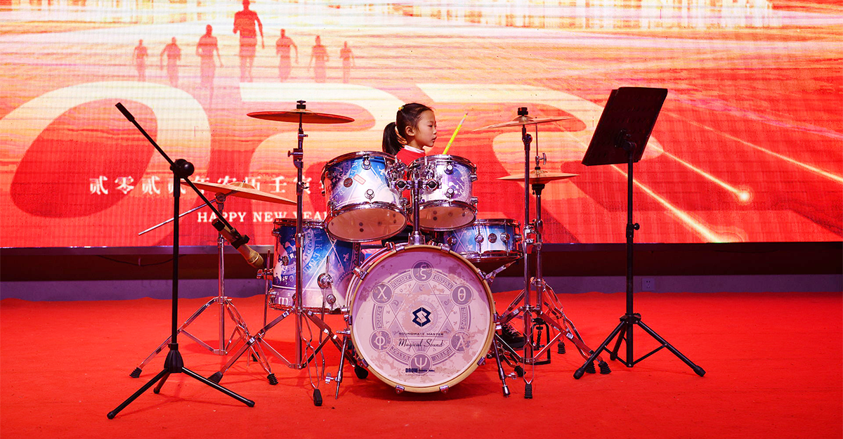 接下来是个大家伙,把一整套架子鼓搬来现场也是不容易,技术部顾健美的女儿子恒为我们带来炒鸡震撼的架子鼓表演《踏山河+像风一样自由》: