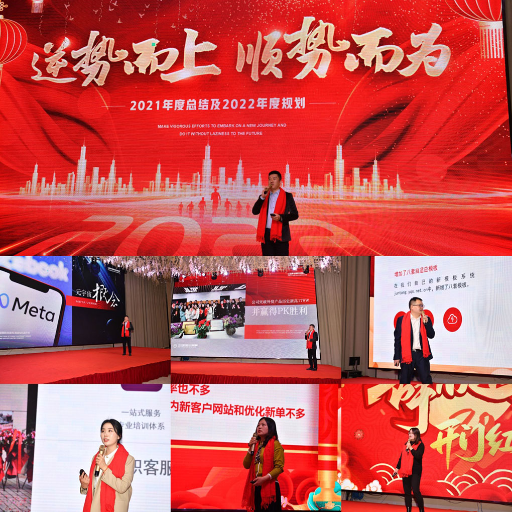 首先年轻有为的康总先从互联网大事件:元宇宙、抖音、美团等爆发延伸谈到我们君通大事件:踏青春游→君通周年庆→敬老院公益行等,回顾过往,历历在目,感恩康总尹总为我们打造的君通这个大平台,让我们可以学到很多、成长很多。对于2022年,对君通人来说有了新的挑战。需要君通人共同努力奋斗去实现。接下来各部门领导依次进行了2021年年度总结以及2022年的展望。首先是技术部的杜总,对2021年技术部整体工作做了总结,并且对今后技术工作做了规划;设计大师顾工和优化大咖彭郁也向我们介绍了网站未来的发展趋势及网络推广营销策略;客服部主管刘苏,作为公司强有力的后盾,强调提升服务增强公司的软实力;市场部大区经理赵经理、张经理,电销部叶经理,柳经理也纷纷上台做了总结并制定了新一年的目标。
