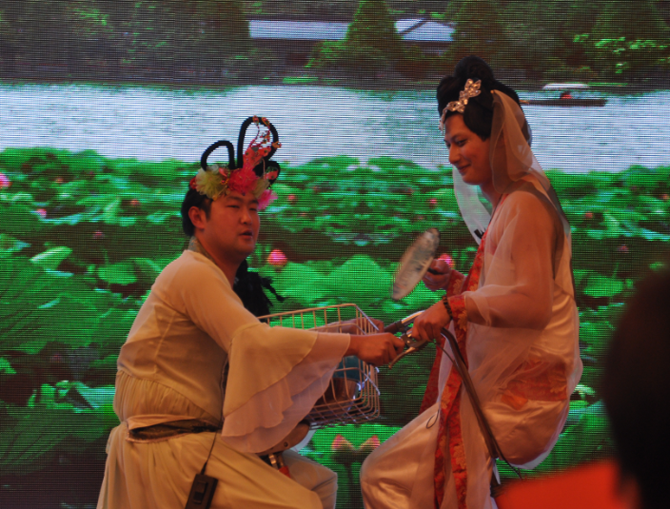 我看到“小青”,我大跌眼镜啊,我突然有点晕船的感觉,那是浦斌啊,小青婀娜多姿的身材在你身上让我们哭笑不得啊,常言道,有情人终成眷属,许仙和白娘子相遇,出演许仙的是新人叶晨,一个字,帅,唱功不寻常。终于“超哥”与许仙相会了,天上下起了小雨,我们再一次被雷到了,小青你居然是人工降雨啊,采用打农药的喷雾器,我不得不佩服“三个男人一台戏”,居然有这么好的效果。佳小品奖你们是当之无愧啊!!